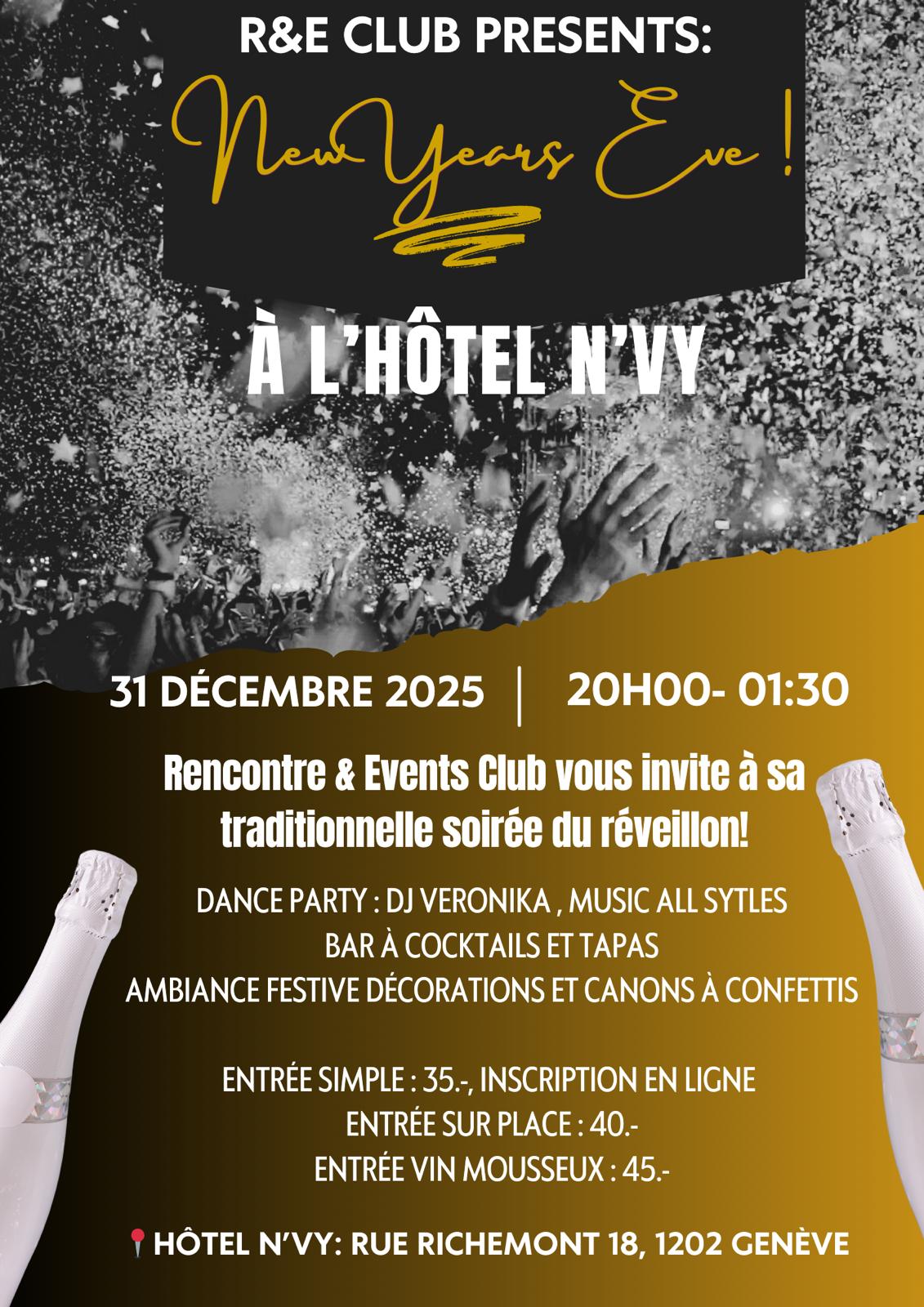 Commencez votre nouvelle année 2026 dans un hôtel 4 étoiles décoré avec des objets d’arts uniques. Ambiance raffinée agrémentée d’éléments festifs et de cotillons. Pendant cette soirée, DJ Veronika vous fera danser avec un mix « All Styles » explosif jusqu’à 01h30. Réservation obligatoire via notre site internet.